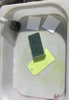 I am a big fan of spraying out in the garden, especially if I want to do big sheets of card. I have been known to re-purpose A1 mount boards this way, spraying over the boring white back. Elaine Kettle likes using her garden too.